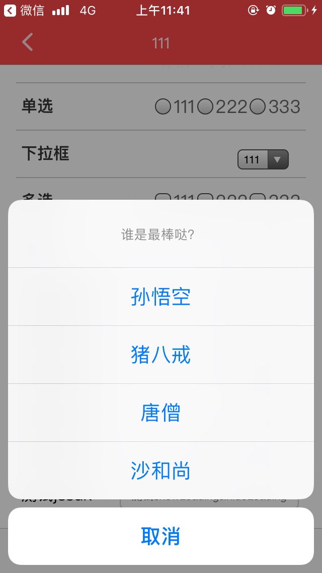 { "title": "谁是最棒哒?",//标题 "cancelButton": '取消', //取消按钮文本 "otherButtons": ["孙悟空","猪八戒","唐僧","沙和尚"], //其他选项按钮名称 "onSuccess": function, //成功回调 "onFail": function, //失败回调 }